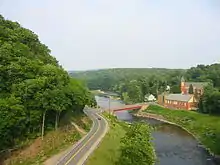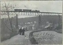 By 1885, the bridge supports were reinforced and the track was converted from broad gauge to standard gauge.[1] In 1888, the Wallkill Valley Railroad received a permit from the town of Rosendale to "construct and maintain abutments to support [the] trestle" as long as such work did not interfere with traffic along the underlying highway (present-day NY 213). That same year, the Delaware and Hudson Canal allowed the railroad to temporarily use some of its property by the Rondout Creek to place bents for bridge repairs.[18] The waterway beneath the trestle could be quite treacherous; so many people drowned that the area became known as "Dead Man's Stretch".[19] There have been reports of ghostly "apparitions" in the area, particularly of a white dog.[20]