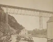 Though the trestle was difficult to build,[8] and viewed as weak by modern standards,[9] it was remarkable for its time,[10] and can be considered the "most awesome part" of the Wallkill Valley rail line.[3] Construction on the bridge's abutments began in August, 1870 by A. L. Dolby & Company, but work on the superstructure by the Waston Manufacturing Company did not begin until the following year due to problems with quicksand during the excavation.[11][12] Sections of the superstructure were built in Paterson, New Jersey.[13] The bridge originally had seven wrought-iron spans and two shorter wooden spans;[3] the longer spans were each[14] 105 feet (32 m) in length.[13] The bridge cost $250,000 to build,[15] and followed a Post truss design.[1] Roughly 1,000 short tons (910 t) of iron and 420,000 board feet (990 m3) of timber went into its construction. At the time of its completion in January, 1872, it had the highest span of any bridge in the United States.[11][12] Due to its height, it could "scarcely be crossed for the first time without something like a feeling of terror".[16] The bridge allowed the rail line to continue north to Kingston.[3]