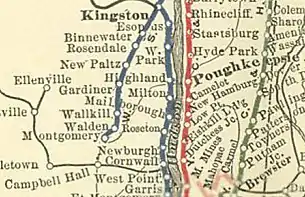 A. L. Dolby & Company was contracted to complete the rail line between the bridge and Kingston. The track reached the Kingston Railroad Station in November 1872.[7] By this time, Ulster and Delaware Railroad trains were running regularly to and from Kingston.[lower-alpha 1]