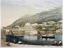 ![]() An old postcard depicting Rosia Bay circa 1909, with Parson's Lodge Battery (left) and Victualling Yard (centre). | |
