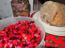 According to some sources, the word rosolli comes from the Russian word rassol, meaning brine, although it is not known how this came to refer to the dish in question.[1] In western Finland, alternative terms such as punainen salaatti (literally "red salad", rendered dialectically) or sinsalla (probably from the Swedish word sillsallad, for "herring salad") are traditionally used.