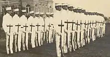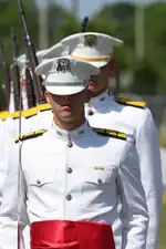 Since inception, the uniform of the Ross Volunteers has consisted of white trousers and blouses with gold trim, worn with peaked hats.[11][lower-alpha 1] Officers wear a distinctive, crimson waist sash.[11]