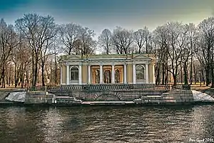 The pavilion sits in the northern end of the Mikhailovsky Garden, on the southern bank of the Moyka River. Designed in the Neoclassical style, it has an open Doric colonnade connecting two square rooms, cast-iron fences, and a pier on the river accessed by two flights of granite steps.[1][2] The pavilion is in the east of the garden, off the centre line of the Mikhailovsky Palace to the south, but aligned with the centre line of the Field of Mars to the north. Explanations for this are either that Rossi had planned a second pavilion to be built to the west, creating a symmetrical view to and from the Mikhailovsky Palace, but the second pavilion was never built; or that it was a deliberate choice by Rossi to connect the Mikhailovsky ensemble with the Field of Mars ensemble on the other side of the river.[2][3][4]