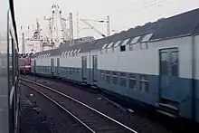 For a long time services between Rostock and Warnemünde were operated with double-deck push-pull trains. For a period trains were operated with two coupled sets of four double-deck carriages (sharing bogies), but from the mid-1970s trains used in commuter traffic were partly composed of three coupled sets with a total of twelve cars. In the 1980s, the trains were replaced by double-deck carriages with their own bogies, which were modernised in the 1990s and were still in use in 2013.