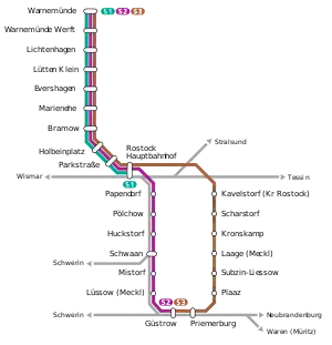 The Rostock S-Bahn (German: S-Bahn Rostock) is a S-Bahn (suburban railway) network in Rostock in the German state of Mecklenburg-Vorpommern. It consists of three lines with a total length of about 90 km. Line S1 runs from Rostock Hauptbahnhof (main station) to Warnemünde within the Rostock urban area. S-Bahn operations started on 28 September 1974. Later, the lines to the north-east to the port (Seehafen) of Rostock and to the south to the town of Güstrow via Schwaan were included in the S-Bahn network. The line to the port was discontinued in 2012, but at same time the line to Güstrow via Laage was included as line S3 of the S-Bahn. Until 2014 the rolling stock mainly consisted of push–pull trains with Waggonbau Görlitz double-deck coaches. Since then all lines have been operated with new Bombardier Talent 2 railcars.
