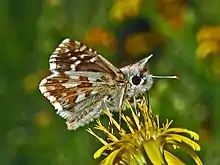 The wingspan of Pyrgus onopordi can reach 22–28 mm. The upper side of the frontwings and hindwings is dark brown or khaki with a slight yellowish tinge, white markings, and a white fringe on the edge. The underside hindwings is light yellow-brown marbled with a few large white spots, including a characteristic anvil-shaped discal mark bordered with dark lines in the cells four and five.[3][4] Females are darker and usually larger than males.[5] Unlike most European Pyrgus species this skipper can usually be readily identified in the field as it is noticeably paler than its congeners. This is due to a heavy dusting of yellowish scales which overlies the dark brown base colour.