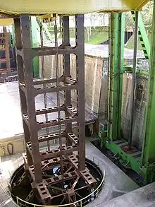 The overall height of the lift measured from the base of the underground float chambers to the upper cross beams is 97.21 metres. The water depth in the trough is usually 2.5 metres.