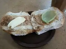 ![]() A plate of roti bakar, with butter on the left slice, peanut butter and kaya on the right slice. | |