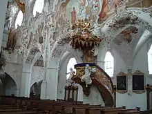 In the 18th century the medieval interior of the church was redecorated in the ornate High Baroque style by painter Matthäus Günther and stuccoist Josef Schmuzer. With the secularization of the Bavarian monasteries under Montgelas in 1803 the monastic buildings were pulled down and the noteworthy library sent to a paper mill; the Abbey church became a parish church, which it remains to this day.