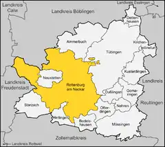 Suburban districts of Rottenburg: Bad Niedernau, Baisingen, Bieringen, Dettingen, Eckenweiler, Ergenzingen, Frommenhausen, Hailfingen, Hemmendorf, Kiebingen, Obernau, Oberndorf, Schwalldorf, Seebronn, Weiler, Wendelsheim and Wurmlingen.
