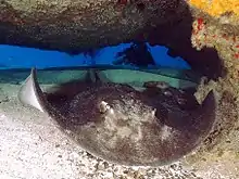 The round fantail stingray (Taeniurops grabatus) or round stingray, is a poorly known species of stingray in the family Dasyatidae. It inhabits sandy, muddy, or rocky coastal habitats in the eastern Atlantic Ocean and the southern Mediterranean Sea. This dark-colored ray typically reaches a width of 1 m (3.3 ft), and can be identified by its nearly circular pectoral fin disk, short tail, and mostly bare skin. The round fantail stingray hunts for fishes and crustaceans on the sea floor, and exhibits an aplacental viviparous mode of reproduction. The International Union for Conservation of Nature (IUCN) does not yet have sufficient information to assess the conservation status of this species.