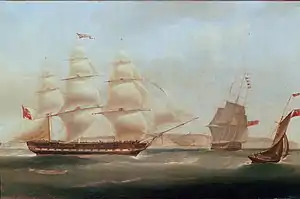 ![]() The East Indiaman Roxburgh Castle (left), with the ship Sir Edward Paget off Dover, by William John Huggins (1781–1845); National Maritime Museum, Greenwich | |