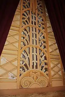 The auditorium decoration repeats the stepped motif of the facade, the ceiling stepping down to meet the walls at an entablature seemingly supported by pilasters. A wavy Art Deco frieze on the entablature and the perforated panels between the pilasters contrast with the angular theme. The wall panels comprise two elements, a central vertical row of five perforated, fan-like elements on each side of which is a vertical row of six rectangles containing diagonal strapping. The light fittings on the pilasters and proscenium splays are designed as angular vase elements. A number of these wall panels are fixed over the shuttered openings to the outside. These as well as the decorative grille running the length of the ceiling in the auditorium were incorporated as a way of ensuring air circulation and cooling in summer and were closed in winter.[1]