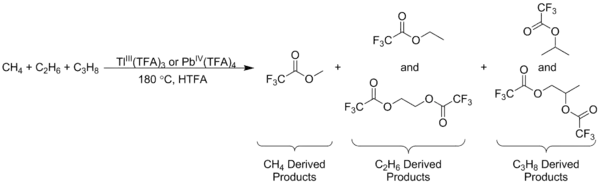 Periana published an article in the multidisciplinary journal Science describing the use of main group trifluoroacetate salts of lead and thallium that convert a natural gas stream (comprising methane, ethane, and propane) to the respective trifluoroacetate esters.[6] It was found that the system readily led to the rapid oxidation of the natural gas stream at 180 °C and was capable of reacting with a mixed gas stream or each alkane independently.[7]