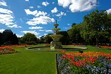 The Royal Exhibition Building, with its fountain on the southern or Carlton Gardens side.