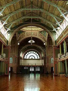 The Royal Exhibition Building was designed by the architect Joseph Reed of Reed and Barnes architecture, who also designed the Melbourne Town Hall, the State Library of Victoria, and the Baroque style gardens. The Royal Exhibition Building was the largest design completed by Reed and Barnes.[3] According to Reed, the eclectic design was inspired by many sources. Composed of brick, timber, steel, and slate, the Exhibition Building is representative of the Byzantine, Romanesque, Lombardic and Italian Renaissance styles.[4] The dome was modeled on the Florence Cathedral, while the main pavilions were influenced by the style of Rundbogenstil and several buildings from Normandy, Caen and Paris.[5] The building has the scale of the French Beaux Arts, with a cruciform plan in the shape of a Latin cross, with long nave-like wings symmetrically placed east–west about the central dome, and a shorter wing to the north.[2] The Great Hall is still in beautiful condition, crowned by an octagonal drum and dome rising 68 metres, and 18.3 metres across. The dome was formed using cast iron and timber frame and has a double shell. At the crossing, windows in the drum of the dome bring in sunlight for a bright open space. The interior is painted in the colour scheme of 1901, with murals and the words "Victoria Welcomes All Nations" under the dome surviving from 1888.[6] In 1888, electric lighting was installed for the Centennial International Exhibition, making it one of the first in the world that was accessible during night time. The interior decorations changed between the two exhibitions of 1880 and 1888. In 1880, the walls were left bare and windows and door joinery coloured green. In 1888, walls were painted for the first time. The decoration was by interior designer John Ross Anderson.[7]