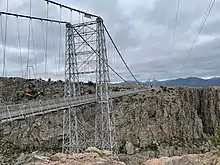 - ↑ The main span measurement on the HighestBridges website is 938 ft (286 m), measured with a laser rangefinder.[10] The main span figure of 880 ft (268 m) continues to be listed on both the Royal Gorge Bridge website[4] and the Structurae.net website.[2]