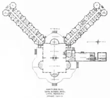 Although it was opened in August 1901, the hotel was completed the following year. It accommodated 350 guests and the final construction cost was $171,908.25.[7] The Venetian design featured two three-storey guest wings that were connected in the center by a main building. Two towers flanked the main block and offered panoramic views of the lake. The main building included a central rotunda and a three-storey verandah. Jarvis's design borrowed many elements from the winter resorts in Florida built by Henry Flagler. The property also had three cottages, riding stables, tennis courts, a nine-hole golf course, and lawn bowling greens. A boathouse and wharf were provided for the steamers to deliver and pick up guests. The Muskoka Lakes Navigation Company built its flagship the SS Sagamo specifically to cope with the guests travelling to the hotel.