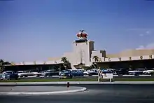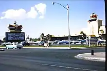 Fishman bought out his former partners' interest and reapplied for a gaming license in April 1954.[11] Two months later, Fishman hired Hahn-St. John Construction Company to build the resort.[12] Groundbreaking took place on July 8, 1954,[13] and construction began on August 16, with completion expected by the end of 1954.[14] The Royal Nevada was designed by Paul Revere Williams, while John Replogle of Las Vegas served as the structural engineer.[15][16][17] The resort was built at a cost of $5 million.[18][19] A large, jeweled crown was located above the entrance,[20] and was made of three karat gold leaf and glass.[21] It was designed by Young Electric Sign Company (YESCO).[22] Another large crown was located atop the resort's roadside sign.[23][24] Parts of the crown were made of fiberglass, which was used to represent velvet material.[25]