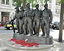 The sculptural group depicts the five-man crew of a World War II–era Comet tank at 1½ times life size.[1] General Sir Antony Walker, who was in charge of fundraising for the memorial, described it as "a memorial to the men of the regiment, rather than the machines".[2] It is an enlarged version of a maquette by George Henry Paulin in the Tank Museum, Bovington, Dorset, which dates to 1953. Mallock's husband had been an officer in the RTR in the 1960s.[2] A resin cast of Mallock's group also stands outside the Tank Museum.[2]