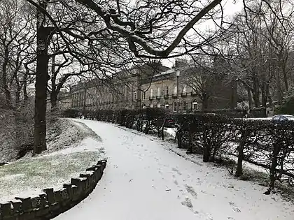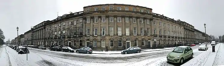 Royal Terrace is a continuous straight structure of about 360 metres, reputedly the longest Georgian terrace in Europe.[14] It is 30 metres longer than the Royal York Crescent (1791–1820) in Clifton, Bristol.[15] The Moray Estate claim a single built-up environment of nearly 600 metres,[16][17] but unlike Royal Terrace, this is a series of unbroken streets rather than a single entity.