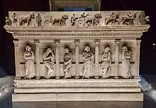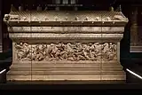 Hellenic style sarcophagus, shaped like an Ionic temple and made of Pentelic marble with polychrome reliefs.[66] The trough stands on a 0.4 m (1.3 ft) pedestal consisting, from bottom to top, of a flat band, a row of egg-and-dart motifs framing an intricate relief depicting a hunting scene, a molding and a final flat band that serves as a plinth. On top of the plinth, a row of 14 Ionic columns and four pilasters enshrine 18 female figures in mourning.[67] The columns are surmounted by an architrave. The trough measures 2.68 m × 1.38 m (8.8 ft × 4.5 ft) and 1.29 m (4.2 ft) high.[67]