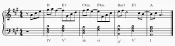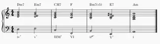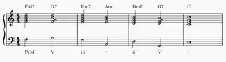 It involves the seventh chords of IV, V, and iii, along with a vi chord; for example, in the key of C major, this would be: FM7–G7–Em7–Am.[3][2][4]