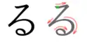 る (hiragana) begins with a horizontal stroke to the right, followed by a slightly longer, angular stroke going down and to the left. Finally, a curve and loop are added to the bottom that somewhat resembles the hiragana no (の). The character as a whole is visually similar to the hiragana for ro (ろ).