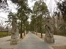 The 250-m long Wengzhong Road is the second section of the Spirit Way (Shendao) of the Ming Xiaoling Mausoleum. It is lined with the statues of civil and military officials, two pairs of each.