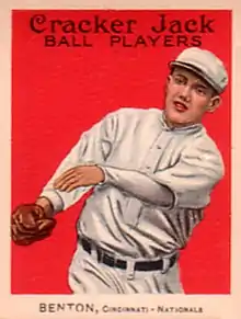 Benton's major league career began in June 1910, when his contract was purchased by the Cincinnati Reds for $7,000 from Macon of the South Atlantic League. He pitched in 18 games for the Reds in 1910 and 1911 combined. In 1912, Benton led the league in games pitched (50), games started (39), batters faced (1302), and batters hit by pitch (18); he finished that season with an 18–20 win–loss record.[1]