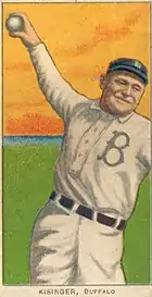 In June 1910, after nine-and-a-half years with the Buffalo club, Kisinger was traded to the Jersey City team in the Eastern League in exchange for George Merritt.[5] At the time of the trade, The Buffalo Courier wrote: "There is not a doubt in the world that Kisinger is a great pitcher. He has everything that a first-class twirler needs, but of late years he has been such a notorious in-and-outer that even some of the most loyal fans soured on him. Rube started here like a whirlwind and became one of the most popular players that ever wore the home white, but as years passed he began to show indifference if the rest of the team went loosely with the result that he became known as a great 'front runner,' a pitcher who would pitch his head off if his team was leading, but who shirked if the other team got the jump on him."[6]