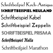 Koch's first non-blackletter typeface was the delicate roman Koch-Antiqua, a display face with a low x-height.[16] Its oblique features inline capitals in the larger sizes, an idea inspired by the traditions of blackletter capitals.[17]