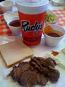 - ↑ "Austin - 620 Menu". Rudy's "Country Store" and Bar-B-Q. Retrieved August 18, 2019.