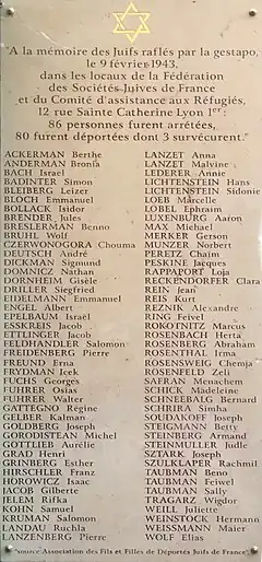 - "Lyon: une plaque pour les victimes de la rafle du 9 février". 20minutes.fr. 13 February 2011. Retrieved 16 May 2016.