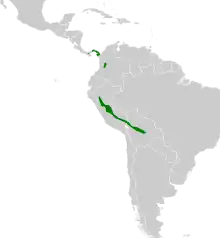 The species inhabits the Pacific and Caribbean mountainsides of Peru, Bolivia, Colombia, Ecuador, Panama, and Costa Rica;[3] and at least one observation of the species has been reported in western Brazil.[7][4] The species is primarily found in altitudes of 500m 1,900m above sea level,[7][4] likely inhabiting higher altitudes when breeding and lower when not.[5] Rufous-crested Croquettes favour humid forests with evergreen or semi-deciduous compositions, and travel large distances within these ecosystems in search of suitable foods.[5] In a homing experiment with frilled coquettes, this genetically similar species was seen to navigate ranges of up to 15 km.[8]