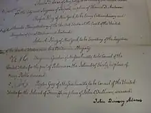 Although when he came to the convention, he was still unconvinced that major changes should be made in the Articles of Confederation, his views underwent a startling transformation over the debates.[4] He worked with Chairman William Samuel Johnson, James Madison, Gouverneur Morris, and Alexander Hamilton on the Committee of Style and Arrangement to prepare a final draft of the U.S. Constitution. King was one of the most prominent delegates namely because of playing "a major role in the laborious crafting of the fundamental governing character."[9] The Constitution was signed on September 17 but needed to be ratified by the states.[9] After signing the Constitution, he returned home. He went to work to get the Constitution ratified and unsuccessfully positioned himself to be named to the U.S. Senate.[9] The ratification passed by the narrow margin of 187–168.[9] With the ratification passed, Massachusetts became the sixth state to ratify the constitution in early February 1788.[9]