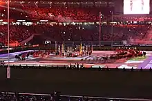 The opening ceremony took place at Ajinomoto Stadium in Tokyo on 20 September 2019 at 18:30 (JST).[25] The ceremony featured a showcase of traditional and modern Japanese culture, as well as the culture of rugby union, and told the story of the evolution of rugby union in Japan.[26] New Zealand's Richie McCaw, who captained the All Blacks to the World Cup title in 2015, performed a ceremonial handover of the Webb Ellis Cup.[27] Six jet aircraft of the Japan Air Self-Defense Force's Blue Impulse aerobatic team flew over the stadium.[28] Kiyoe Yoshioka of Japanese pop-rock band Ikimono-gakari sang World in Union, the official song of the Rugby World Cup.[29] The tournament was officially declared open by Fumihito, Prince Akishino of Japan; both he and World Rugby chairman Sir Bill Beaumont gave speeches at the end of the ceremony, with Beaumont saying:[30]
