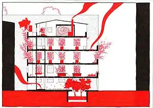 The Ruin Academy occupies an abandoned 5-story apartment building in central Taipei. All the interior walls of the building and all the windows are removed in order to grow bamboo and vegetables inside the house. The plants are situated so that their vegetation grows in front of the glassless window spaces, giving privacy to those inside. The professors and students are sleeping and working in mahogany made ad hoc dormitories and have a public sauna in the 5th floor. All the building is penetrated with 6-inch holes in order to let “rain inside”.[3]