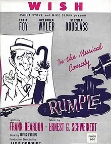 After a pre-Broadway tryout at the Shubert Theatre in Philadelphia starting October 21, 1957,[1] Rumple premiered on Broadway at the Alvin Theatre on November 6, 1957, and closed on December 14, 1957, after 45 performances. It was produced by Paula Stone and Mike Sloan.[2] It was directed by Jack Donohue with choreography by Bob Hamilton, settings and lighting by George Jenkins, costumes by Alvin Colt, and orchestrations by Ted Royal.[3] Chester O'Brien was the stage manager. The cast starred Eddie Foy Jr., Gretchen Wyler, and Stephen Douglass, and included several actors in minor roles who later became famous, including Elliott Gould and Barbara Perry.[2]