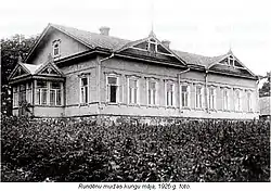Rundēnu School building is located on the territory of the manor, whose owner was Polish landowner Victor Shahno. Now on a place of Rundēnu Manor is only a park. In park of the manor the landowner has planted two malls of trees - on the one hand - lindens' mall, on another - fir-trees' mall. Lindens’ mall is kept and up to now. Fir-trees’ mall has been cut down for building needs during the Second World War. At this time inside the manor is located the school complex.[5] In 1938 construction of a new building of secondary school has begun. Future school director Arthur Burtnieks headed building construction. The school was built by hand, without technique help. In 1939 has opened the doors the spacious three-storey building of school.[5] Now the building of school is empty - in 2007 was last school release.