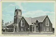 According to tradition, in the 1840s, the choice of a name for the community of five homes and a store was between Russellville—for Thomas Russell, who had the first home in the area and was a doctor—and Shinnville—for Jacob L. Shinn who established the community's first store.[13][14] However, Russellville was actually named about 1842 when Jacob was a teen.[15] Russellville is listed on mail routes in requests for proposals for carrying the mail in 1842,[16] when Shinn was 15, and in 1846, when he was 19,[17] so naming the community after Jacob would have been quite unlikely. However, in the 1840s, his uncle, James Madison Shinn, and father, B. D. R. Shinn, operated a store in the small frontier community, so any truth in the naming tradition may apply to them.[18]