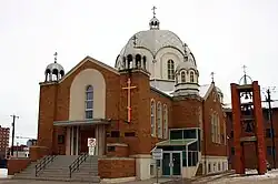St. Barbara Church in Edmonton was founded in 1902. The original building, sitting on the same site as the present on top of Grierson Hill, was a converted two-story residence. It was replaced by a wooden church that was used until 1958. The third and present building was opened officially opened August 8, 1959, and was consecrated as a cathedral.[2] In 2010, the iconostas was replaced with icons from Russia attached to a screen carved by a parishioner who is also a master woodworker.[3]