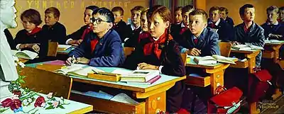 Russian Schoolroom (1967), also known as The Russian Classroom and Russian Schoolchildren, is an oil on canvas painting created by American illustrator Norman Rockwell (1894–1978) and commissioned by Look magazine. It depicts Soviet schoolchildren in a classroom with a bust of Soviet leader Vladimir Lenin.