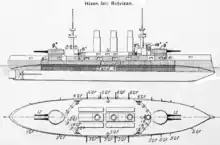 The total weight of the Krupp armour was 3,300 long tons (3,353 t) or 25.8% of the displacement. The armour was mostly made in the United States, although a contract was let for deck armour from Russia on 6 January 1899.[15] The main waterline belt had a maximum thickness of 9 inches (229 mm) and tapered to 5 inches (127 mm) thick at its lower edge. It was 256 feet (78.0 m) long and 7 feet (2.1 m) high, of which about 3 feet (0.9 m) was above the waterline. The 6-inch upper belt was as long as the main belt and was 7 feet 6 inches (2.3 m) high. Armour plates 2 inches (51 mm) thick protected the ends of the ship to a height equal to that of the main and upper belts combined. Bulkheads 7 inches (177.8 mm) thick provided transverse protection for the ship's vitals. The lower casemate armour was 5 inches (127 mm) thick and armour screens 1.5 inches (38 mm) thick separated each gun. The upper casemate armour consisted of five inches of armour plate with semicircular 1.5-inch thick gun shields enclosing the guns.[11]