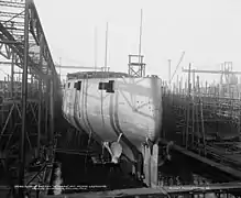 Named after the Swedish ship of the line Rättvisan (Justice) which was captured by the Russians at the Battle of Viborg Bay in 1790,[16] Retvizan was ordered on 2 May 1898 for delivery in thirty months. The detailed sketch design was forwarded at the end of 1898 to Saint Petersburg for approval and work commenced on the ship around that time, although she was not officially laid down until 29 July 1899 as yard number 300. Construction was delayed by a strike at the shipyard that began in August 1899 and continued until the strike collapsed in early 1900. Other delays were caused by differences between American and Russian shipbuilding techniques and the insistence of the Naval Ministry on approving any design changes even though a Russian commission had been sent to Philadelphia to supervise her construction.[17]