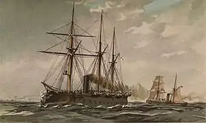 Pervenets rolled heavily in service, therefore bilge keels were fitted during the winter of 1864–65, the first used on a Russian ship.[3] On 15 August 1869, she was taking part in an exercise off Hogland with Kreml, Oleg, Petropavlovsk and Vityaz when Kreml rammed Oleg, which sank with the loss of 16 of her 445 crew. Pervenets rescued some of the survivors.[10][11] To alleviate the cramped conditions of the steersmen, the ship's wheel was transferred from the gun deck to a platform that spanned her bulwarks in front of the mizzenmast in 1871. In 1872 she evaluated the Davydov fire-control system that could fire all guns electrically and indicated to the gunners where their guns should be aimed. The conning tower was removed in 1876–77 and new boilers were installed. These increased the engine's power to 1,300 indicated horsepower (970 kW) and Pervenets reached 8.5 knots on sea trials. She was reclassified as a coast defense ironclad on 13 February 1892 and was placed in reserve on 23 December 1904. The ship was disarmed the following year and stricken from the Navy List on 15 September 1905. Turned over to the Port of Kronstadt for disposal, she was sold on 8 September 1908 and renamed Barge No. 1 (Barzha No. 1).[12]