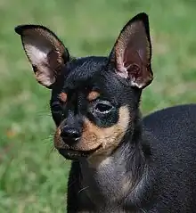 The Russian Toy (also known as the Russian Toy Terrier, and in Russia as the Russkiy Toy , Russian: Русский той) is a very small breed of dog originally bred in Russia from the English Toy Terrier. There are two types of coats in the breed: smooth coat and long coat. The smooth-coated variety was previously known as the Russian Toy Terrier and long-coated as the Moscow Long-Haired Toy Terrier. Both were brought together under the same Russian Toy Terrier name in 1988 and the "Terrier" was dropped from the name when the breed was added in 2006 to the official list of breeds registered with the Fédération Cynologique Internationale[1] and has been registered in the Foundation Stock Service of the American Kennel Club since 2008, allowed to compete in AKC companion events since 2010.[1][2] The first official breed standard of the two varieties was written in 1966 in Russia.[1]