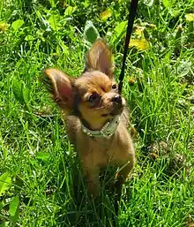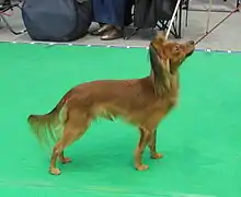 The Russian Toy is one of the smallest breeds in the world, measuring between 20 cm and 28 cm and weighing anywhere between 1,5 kg and 4kg. It has a small, distinctive head with large eyes and triangular ears. In countries where docking is prohibited, the tail is curved in the shape of a sickle. There are two types in the breed, distinguished by their coats; one is long-coated and the other smooth-coated.[3][4] The smooth-coated dog has a short, shiny, close-lying coat. The long-coated variety has a longer coat and profuse feathering in the ears, legs and tail. The feathering or "fringe" on the ears is usually 3 to 5 cm long, can be straight or with a slight wave. It will be grown by the age of three and should completely cover the outer edges and tips of the ears.[5]