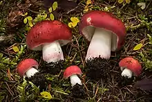 Russula sanguinaria, commonly known as the bloody brittlegill or rosey russula,[1] is a strikingly coloured mushroom of the genus Russula, which has the common name of brittlegills. It is bright blood-red, inedible, and grows in association with coniferous trees. It was previously widely known as Russula sanguinea.