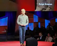 Rutger C. Bregman (born 26 April 1988) is a Dutch popular historian and author. He has published four books on history, philosophy, and economics, including Utopia for Realists: How We Can Build the Ideal World, which has been translated into thirty-two languages. His work has been featured in The Washington Post, The Guardian and the BBC. He has been described by The Guardian as the "Dutch wunderkind of new ideas"[2] and by TED Talks as "one of Europe's most prominent young thinkers".[3] His TED Talk, "Poverty Isn't a Lack of Character; It's a Lack of Cash", was chosen by TED curator Chris Anderson as one of the top ten of 2017.[4]